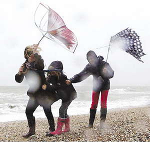 英国近日遭遇强风天气,几位行人顶风艰难行走