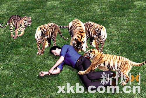 园林工坠入猛兽谷后遭群虎围攻的模拟图。制图:杨志成