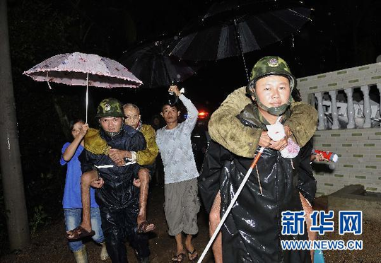 10月16日,海南省万宁市万城镇民兵预备役官兵正在转移万城镇仁里村村民。 15日以来,海南又迎来新一轮强降雨,多个市县再次出现城市内涝、村庄群众被困等灾情。海南省万宁市政府所在地万城镇约有1.57万名群众受困,目前已紧急转移2600余人。新华社记者 郭程 摄