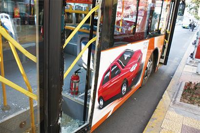 在刘先生的指引下,记者在离事故现场100米处找到了造成交通事故的两辆车。只见公交车后侧车门被撞得凹陷进去,车内满是米粒大碎片,绿色的“猎豹”停在公交车后面,车体的横向保险杠被撞弯呈90度与车体垂直。“当时车辆已快到站了,我看马路右侧内车道空着,就想靠过去进站,结果后面这车没减速就冲了上来,幸好这车门是特殊玻璃制成的,要不然非伤人不可。”公交司机说。 (王晓先 王寿林 摄影报道)