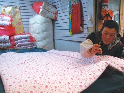 “我们就是赚个手工钱,人家大厂家肯定瞧不上这种小生意。”单女士说,传统棉被的价格比较透明,像好的新棉花今年价格为25元一斤,比去年上涨10元,包花布9元一米,比去年涨2元,手工费仍是每床20元,这样算下来,一床大被子要215元,比去年上涨近四成。(记者 王婷 摄影报道)