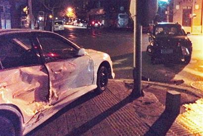 三菱轿车司机惊魂未定站在车旁跟朋友商量着。“我当时看到前面是黄灯,还以为要转成绿灯,这才开过去,谁想到这辆越野车从侧面冲出,撞在我的车身右侧。”三菱轿车转90度,来了个特技漂移,冲上了路边的人行道,还把垃圾箱给刮倒了。而越野车司机姜先生称,他本来打算送车上两名女士回家,当时路口是绿灯,没想到这辆三菱轿车突然冲出,他刹车不及撞了上去。交警部门正在调查此事。 (黄飞 于滈 徐栋 摄影报道)
