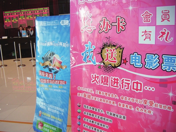 “两张电影票+两杯可乐共36元”,3日上午,百丽广场三楼百老汇影院外面的易拉宝广告牌吸引了不少人的眼光。据工作人员介绍,这是百老汇正在与满座网开展的看电影团购活动。而此时,福州南路的大屏幕上,也不时闪现着华臣影院4周年店庆的广告。“零售及普卡会员全天30元金卡会员25元”的字样也让一些年轻人驻足。万达影城网站上也挂出了本月为电影月的宣传条幅。一时间,岛城高端影院的价格竞争似乎全面展开了。