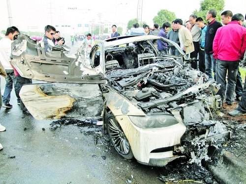白色宝马M3起火燃烧成框架。记者 贝远景 摄