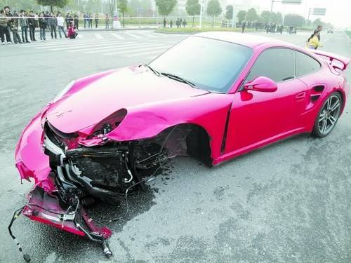 红色的保时捷跑车横跨在十字路口,左前轮被撞飞到20米开外,车子的水箱被撞破,随着车辆的急速刹车,漏出的水在路面上画出一个大圆圈。