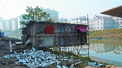 记者昨在黄孝河护坡边见到这些简易房,一排大约有五六间,都是用纸板塑料布拼成四面的墙,而底部则用几根工地上的锈钢管和木板斜插在坡上支撑着,半截屋子悬在空中,下面就是黄孝河,远望去颤颤巍巍的。此时,屋内10多工人聚集在一起吃饭,旁边就是黄浦大街至金桥大道快速通道的在建工地。