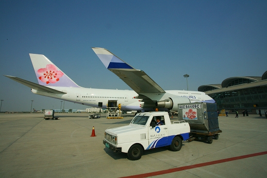 尾翼上喷绘了巨大花朵图案的华航客机在候客