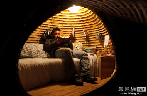 晚上7点半左右,街头不少人已穿上羽绒服,戴海飞的“蛋形”小屋里,温度表显示4.4℃。小屋里摆设简单,一张约一米宽的床,床头放着几本书。床尾藏有一个水箱,里面有压力系统,可以把水压上来,供洗漱用。“一水箱水大概能用三天,用完了就到公司去接。”戴海飞说。