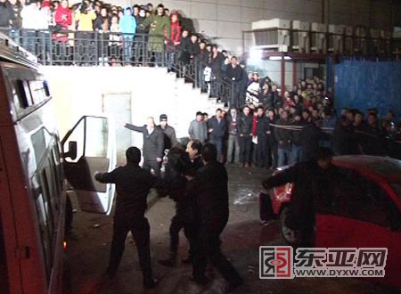 随后又有几位年轻男子朝“红色马六”踢去,还有人用拳头砸车的风挡玻璃:“你赶紧从车里出来,大家都等着你道歉呢。”站在商场二楼围栏观看的市民朝“红色马六”轿车扔雪球,还有人扔砖头、烟头,民警忙着不断劝大家不要情绪激动,一位民警头部受创流血。