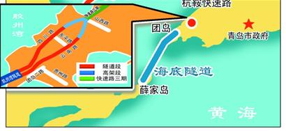 青岛海底隧道南接黄岛区的薛家岛,北连青岛主城区的团岛,下穿胶州湾湾口海域。隧道全长约7800米,其中海底段隧道长约3950米。设双向六车道,设计车速80公里/小时。路线等级为城市快速路,设计基准期为100年。胶州湾隧道于2006年12月27日正式开工建设,2010年4月全线贯通,2011年上半年通车。通车后,青岛市民开车经隧道,5分钟就可横跨海底。目前市运管部门正在就制定海底隧道公交车通行方案开展相关调研,初步规划在海底隧道通车后,青岛至薛家岛端开通直达公交线路,青岛主城区设置3到4条大站公交线,在薛家岛端口附近设置公交枢纽站,主城区的大站公交车通过海底隧道,直达薛家岛端公交枢纽站。记者 芦智峰