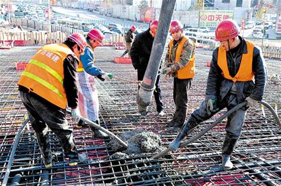 昨日上午10时,记者来到箱梁浇筑现场,看到了一幅冬日鏖战的火热场景:数十名工人在1号桥上忙碌着,他们中有的引导泵车导管向箱梁浇筑混凝土,有的在检查钢筋的捆扎,有的忙着加固箱梁模板。尽管天气寒冷,但每个人都干得井井有条,忙而不乱。