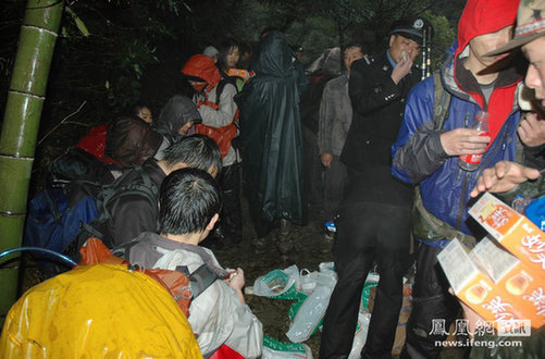 12日下午,这18名大学生被困在黄山云谷寺风景区峡谷,上海与安徽两地公安部门迅速联动,立刻展开救援行动,黄山市派出由公安、消防、综治、防火等部门组成的230多人的救援队伍。图为获救的大学生驴友前来送行。