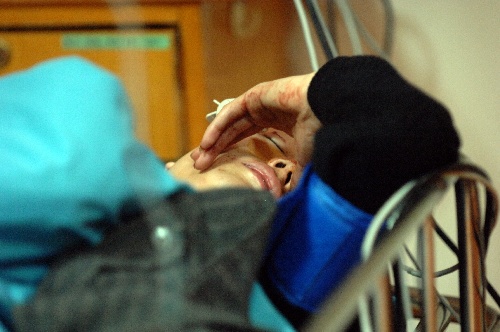 杭州,2010年12月17日 杭州机场高速两大巴相撞交通事故中死亡人数升至六人 12月16日晚,事故中的一名伤者躺在医院观察室的病床上输液。 新华社记者黄宗治摄