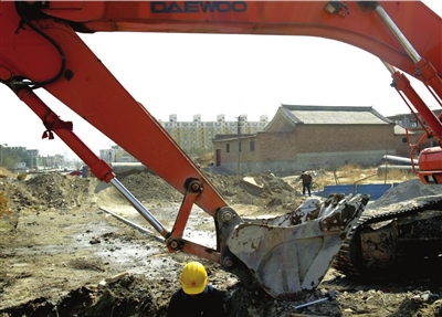 ③2009年,徐家拒绝拆迁,挖掘机在其门前施工。(资料图片) 本报记者朱嘉磊摄