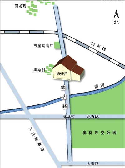 围观者口中的老徐叫徐景明,黑泉村32号的主人。此前黑泉村32号在网上有个称号:北京“最牛钉子户”,这缘于林萃路工程。5年前,北京市规划委发布消息,“连接五环路与回龙观北街的林萃路将开工,通车后,八达岭高速路拥堵的现象将有所缓解。”但林萃路并未在2008年如期完工,其中在黑泉路一段,始终无法完成规划中的贯通,即使后期工程施工方临时做出一些更改,但行驶至此的双方向车辆,只能沿着一条车道,从房子旁边绕行,堵车是经常的事情。2009年,海淀区政府回复居民称,路中一拆迁户迟迟不肯搬迁,索要580万元补偿,远超180万元的补偿标准。