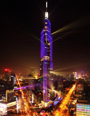 世界第七、江苏第一高楼紫峰大厦18日晚在南京举行落成点亮仪式。这是继上海环球金融中心后,中国大陆地区的第二高度。至此,两岸三地已有六座建筑跻身世界十大高楼行列。