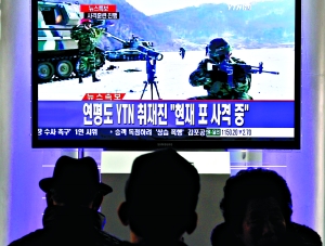 12月20日,首尔,韩国民众观看延坪岛实弹射击演习的电视新闻直播。