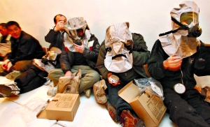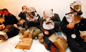 12月20日,居民们在延坪岛防空洞内戴上防毒面具。韩军方官员称,韩国军队在延坪岛的实弹射击训练从当地时间14时30分开始,于16时04分结束。为了防范朝鲜回击,韩国陆、海、空军的战斗力量目前仍保持戒备状态。新华社发