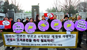 20日,首尔,韩国民众在国防部集会抗议延坪岛实弹演习。