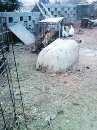 记者随后走进院内,就听到一阵阵的狗吠,一只黑色藏獒被锁在大门右边的一个狭小的铁笼里,冲着记者一阵狂吼。在大门左边有一片狗舍,一名老人正在给狗喂食,这片狗舍里面锁着12只大大小小的狗,有京巴、牧羊犬、还有几只土狗。