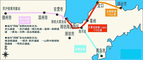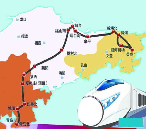 在铁路建设方面,济南-烟台-威海动车直通工程;规划建设青岛-烟台-威海-荣成城际等山东半岛城际铁路;山西中南部铁路通道山东段、德州-大家洼-龙口-烟台、青岛-日照-连云港、黄骅-大家洼等铁路;菏泽-兖州-日照、蓝村-烟台、胶州-新沂、坪上-岚山等铁路电气化改造;重点港口疏港铁路。
