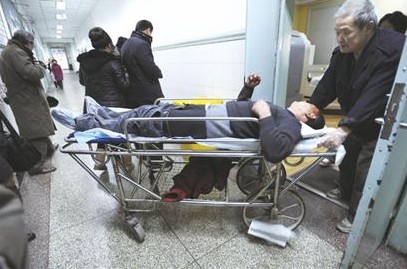 记者随后赶到海慈医院,伤者躺在CT室外的担架车上,双手捂住头部,身体蜷缩,不住地呻吟。“不好,伤者出现抽搐症状了,赶紧叫医生。”急诊室的医生赶来对其进行紧急处置。