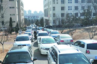 昨天下午2时,开考前,记者在海大、青大等驻青高校的校园里转了转,发现往日平静的校园变得车水马龙。在青大,邻近考试楼的大道上,三排送考的轿车排起了上百米的长队,加上考试楼边上其他几条道上的送考车,三四百辆送考车的“阵容”显得浩浩荡荡,经过的学生只好小心在“车阵”中绕行。