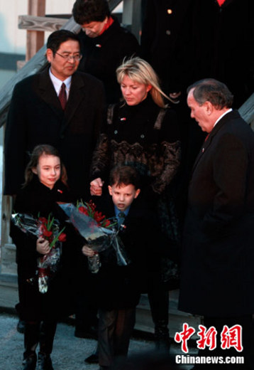 中国国家主席胡锦涛结束了在美国首都华盛顿的访问活动后,20日下午乘专机抵达芝加哥,继续他对美国为期四天的国事访问。图为芝加哥市长戴利(图右)赴机场迎接,戴利的孙子杰克和孙女玛姬在机场手拿鲜花等候迎接胡锦涛主席。中新社记者 魏晞 摄