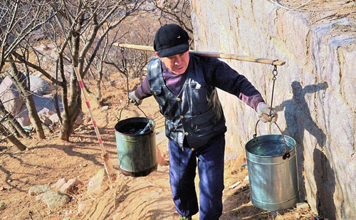 大约几分钟,尹老先生就把两个水桶打满了。他将一个木板盖在了小水坑上后,挑起扁担开始往家走。尹老先生虽然年纪大了,还挑着两个满满的水桶,但走得很稳。