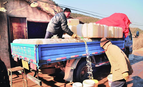 1月23日上午,从滨海大道转入一条山路后,大约行驶了一公里左右来到了北宅街道晖流社区。拉水的汽车来来往往,车上装着满满的塑料水桶。
