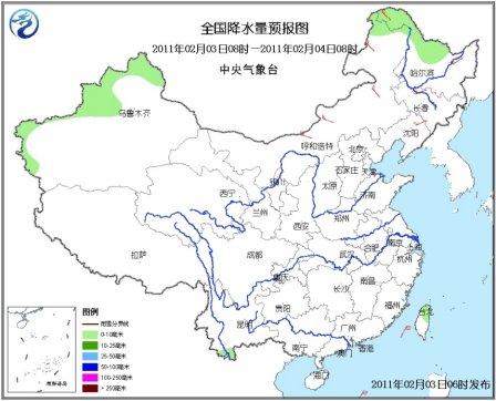 3日08时至4日08时,新疆西部、内蒙古东北部、黑龙江西北部等地有小到中雪(雨)或雨夹雪。内蒙古中东部、东北大部等地有4~6级风;台湾海峡、南海将有5~6级、阵风7~8级风。
