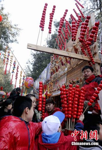 农历正月初六,北京一庙会象征着幸福串串的老北京冰糖葫芦被制作成工艺品,深受儿童及大人的喜爱,争相购买。中新社记