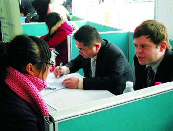 在人才市场二楼,记者看到,在一家汽车行业公司展位前,并排坐着两名招聘人员,其中有一名是外国人,正在用英语和应聘者交流。