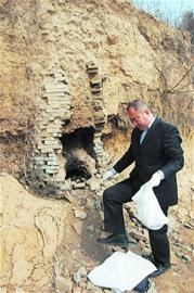 “我在大沽河河道里发现了一个‘古墓’,为了保护它不受破坏,请你们赶紧过来看看。”昨天上午,胶州胶莱镇南王疃村村民王先生告诉记者,因家里地面出现了几条裂缝,他准备用沙和水泥将裂缝堵死。于是,2月8日上午,他拿着铁锨来到村东侧大沽河河道里取沙。就在他准备离开时发现,在河道一段土坡上露出了一些黑砖,他用铁锹铲了几下,眼前景象让他惊讶不已,松动的泥土坍塌后,露出了一个砖砌的“古墓”,在“古墓”里他还找到了三个破碎的瓦罐。拿着瓦罐残片,他找到村内一些老人,但老人均不知道“古墓”的来历。他便立即与记者取得了联系。