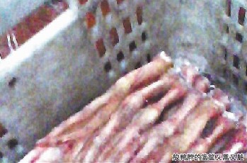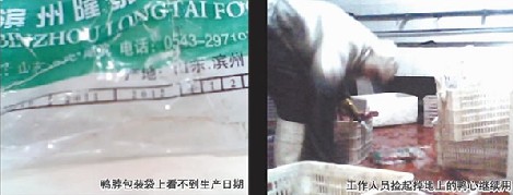 随后,记者走出工作车间,仔细观察了一下所有的包装箱,发现鸭心、鸭脖、鸭翅、鸭爪等能看到的包装箱,上面的生产日期一律空白。记者回到车间后又仔细观察了有包装袋的冻肉,发现无论是鸭心、鸭脖、鸭胗,还是鸭血、鸭翅等,只要是包装箱内有包装袋的 ,生产日期都没有明确标明,并且写得五花八门,让人怎么看都看不明白。