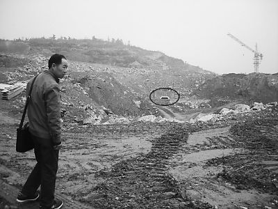 沐氏后人沐广飞站在别墅工地,远处的省级文物保护单位沐英墓(图中画圈处)已经陷入一片工地之中。记者 庄庆鸿摄图片