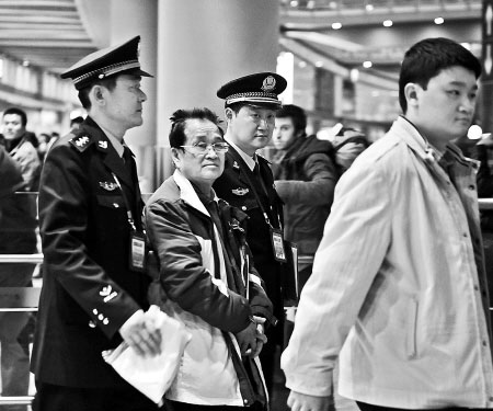 2月17日下午,中国通缉犯曾汉林(左二)乘坐从加拿大多伦多起飞的航班被遣返回国,抵达北京首都国际机场。新华社发