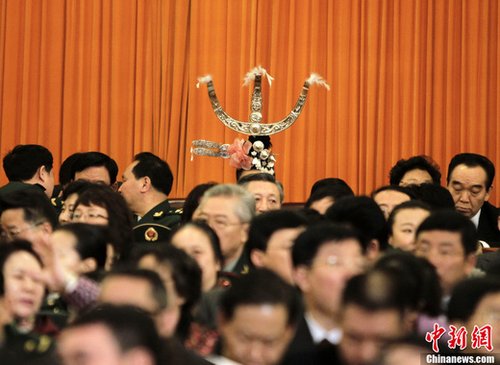 3月4日,十一届全国人大四次会议预备会在北京人民大会堂举行,一位少数民族代表的装饰“脱颖而出”。 中新社发 盛佳鹏摄