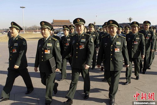 3月4日,十一届全国人大四次会议预备会在北京人民大会堂举行,解放军代表团步入会场。中新社发 盛佳鹏 摄