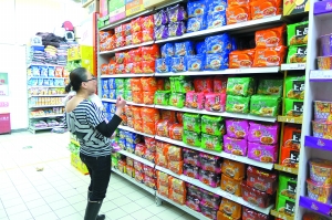 消费者在家乐福双井店的康师傅方便面货架前选购。 晨报记者肖丹/摄