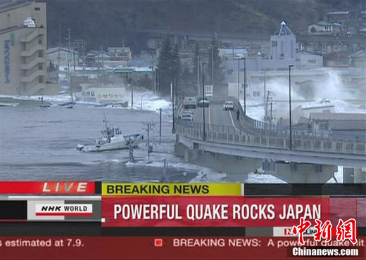 电视画面显示,岩手县沿岸有几十辆车被海浪卷入水中。在宫城县,一艘大船被海浪卷起,冲向防浪堤。