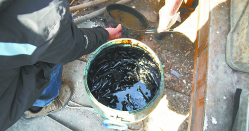 记者暗访青岛黑作坊:记者在海带加工点找到了一桶染料。