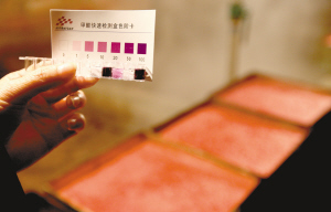 工商执法人员通过甲醛快速检测色阶卡,测出血旺含有大量甲醛。(记者 钱波 摄)