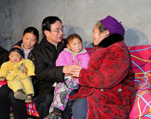3月17日至21日,中共中央政治局常委、中央纪委书记贺国强先后到重庆市黔江区、彭水县、武隆县和主城区等地调研。这是3月19日,贺国强在武隆县仙女山镇石梁子村困难群众陈开侯家,与家中老人热情攀谈。新华社记者李涛 摄