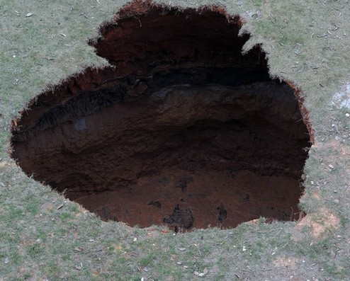 3月27日早晨,深圳福田区上梅林中康生活区第六栋门前的草坪运动场出现一个近5平方米的大坑,原来运动场上的一个两米高运动器材被大坑吞没,这个大坑目测足有8米深。大坑处恰好位于广深港客运专线隧道上方。