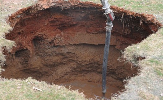 从高空俯看,可以看到坑口周边的土层已经悬空,坑壁都是松湿的泥土,坑底空间远比坑口要大,深约8米左右,坑底已有了厚厚一层泥水。看着这个大坑,不少住户忧心忡忡,他们曾听到地下传出沉闷的异响,如同地下放炮炸山,地面有明显震感,随后通过邻居口口相传,才知道操场地面出现了塌坑。