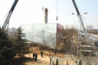 记者在现场看到,由于该处广告牌地处交通要道,车流量密集,一大早崂山城管执法人员就在其拆除范围周边拉起了警戒线,禁止非工作人员进入。20余名施工人员和20名崂山城管执法人员正在现场紧张忙碌着,一台70吨的重型大吊车将专业施工人员送至高炮广告顶部,用钢丝绳拴在一面广告牌的两点处,另一台130吨的重型吊车用钢丝绳拴在两面广告牌的交点处。拴好吊环后两台吊车同时慢慢向上拉紧钢丝绳。气焊工用吊笼升至立柱的上方,用三套气焊机将立柱与广告牌面切开。将近中午12点,终于将立柱与牌面割断。