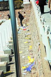 在福宁园里,10多名保洁工人背着蛇皮袋子捡垃圾,一些鲜花的包装塑料纸、塑料袋经常会看到,还有一些食品、果品。工人告诉记者,一上午他已经捡了20蛇皮袋子的垃圾了。