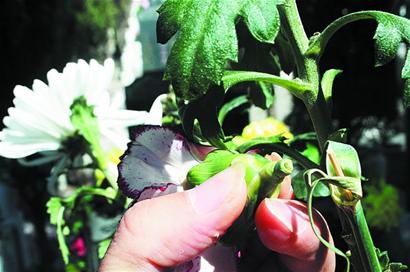 市民王女士见路上商贩售卖的鲜花颜色比较鲜艳,就花10元买了一束。当祭祀结束,她准备将菊花上的花瓣一点点掰下来撒在墓碑上时,却发现菊花的花球和花茎居然断裂开了。仔细一看,才发现这“鲜花”是用牙签连接起来的。“在路上流动卖鲜花的就有五六十人,哪还能找到卖花的人,只能吃哑巴亏了。”王女士说。