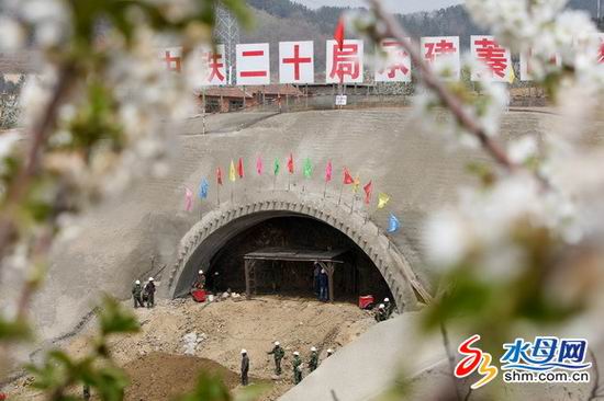 在蓁山隧道入口处上方,有一大片樱桃果园。虽然如今花开旺盛景色不错,但是这些果树却给施工单位中铁二十局出了一道难题。武强说:“种植的果树使得隧道上层土质比较松散,我们发现蓁山隧道的围岩大多为五级围岩,整个岩体土体都不太稳定。为此,隧道入口必须使用型钢钢架进行加强。”